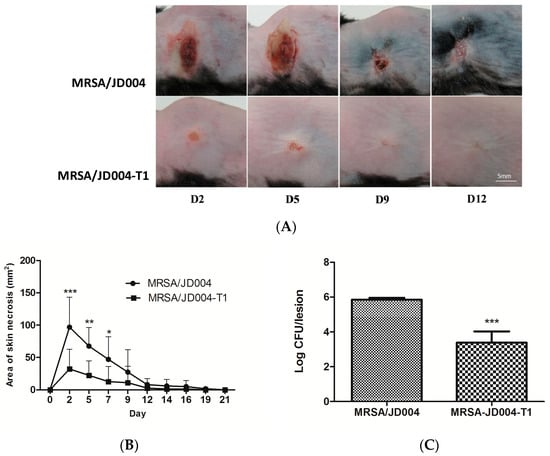 Extent of skin necrosis from mice subcutaneously inoculated with MRSA/JD004 and MRSA/JD004-T1. (A) Marked necrosis in mouse skin inoculated with MRSA/JD004 compared to that inoculated with MRSA/JD004-T1. Skin completely healed a week earlier in the MRSA/JD004-T1 group. (B) Area of skin necrosis. The data are means ± the standard deviations of the mean (n = 6 in each group, *** p < 0.001, ** p < 0.01, * p < 0.05, Bonferroni t-method). (C) Bacterial density in skin lesions three days after inoculation (n = 5 in each group, *** p = 0.0008, paired t-test).