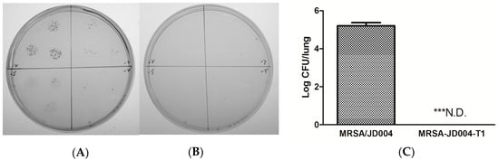 To further investigate the systemic infection by ICG-PDT-treated MRSA, an experimental lung infection was performed. Unexpectedly, no bacteria could be recovered from the lungs of mice infected with MRSA/JD004-T1 followed by three doses of oxacillin. Five logs of bacteria could be isolated from the lung infected with parental cells (MRSA/JD004) followed by the same oxacillin treatment (n = 5 in each group, p = 0.0004, paired Student t-test, Figure 7).