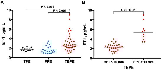 As shown in Table 1 and Figure 1A, the median levels of effusion ET-1 were significantly higher in TBPE group (2.7 pg/mL, range 0.9–9.0 pg/mL) than in TPE (1.8 pg/mL, range 1.3–2.3 pg/mL) and PPE (1.4 pg/mL, range 0.8–3.5 pg/mL) groups (TBPE vs. TPE, p < 0.001; TBPE vs. PPE, p < 0.001), while the ET-1 values were comparable between TPE and PPE groups. This result suggests that ET-1 plays a distinctive role in TBPE rather than in TPE or PPE.