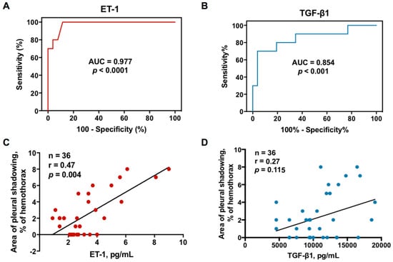 Furthermore, the ROC curves showed that the effusion ET-1 at the cutoff level >3.7 pg/mL had highest sensitivity and specificity for predicting RPT >10 mm in TBPE patients (area under the ROC curve = 0.977, 95% confidence interval (CI) = 0.938–1.016; sensitivity 80%, 95% CI = 44.3–97.5%; specificity 96.2%, 95% CI = 80.4–99.9%) (Figure 2A), followed by TGF-β1 at the cutoff level >13,452.7 pg/mL (area under the ROC curve = 0.854, 95% CI = 0.697–1.011; sensitivity 70%, 95% CI = 34.8–93.3%; specificity 96.2%, 95% CI = 80.4–99.9%) (Figure 2B).