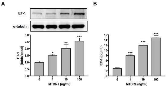 MTBRa induces ET-1 production in primary human PMCs. Cultured primary human PMCs (5 × 10 5 cells) were stimulated with the indicated concentrations of MTBRa for 24 h. (A) The total proteins from cell lysates were analyzed through Western blotting. (B) The levels of ET-1 in the culture supernatants were analyzed by ELISA. Data were shown as mean ± SD of three independent experiments. * p < 0.05, ** p < 0.01 and *** p < 0.001 compared with resting group. MTBRa, heat-killed Mycobacterium tuberculosis H37Ra; PMC, pleural mesothelial cell.