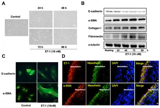Increasing evidence demonstrated that PMCs experience mesenchymal transition upon stimulation by TGF-β1 or bleomycin [12,13,14,15]. In parallel, we demonstrated that ET-1 time−dependently induced protein expression of the myofibroblast−specific marker, α-SMA, while reduced the epithelial cell marker, E-cadherin, and led to phenotypic alteration in primary human PMCs. Concomitantly, ET-1 stimulated human PMCs to produce collagen I and fibronectin that further verify the fibrogenic activity of PMCs in response to ET-1. Moreover, we demonstrated the concurrent expression of ET-1 and α-SMA in the pleural mesothelium of patients with TBPE and that MTBRa stimulated MMT and ECM synthesis in PMCs through the actions of ET-1. Collectively, these results indicate that ET-1 is an important mediator for MMT in PMCs and may, thereby, contribute to pleural fibrosis in TBPE.