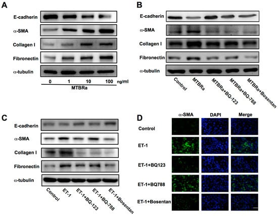 Accordingly, MTBRa was used to stimulate PMCs to investigate the role of ET-1 and MMT in TBPE. It demonstrated that MTBRa concentration-dependently reduced E-cadherin expression, induced α-SMA synthesis, and elicited production of collagen I and fibronectin in MeT-5A cells (Figure 5A). Conversely, pretreatment with the ET-A receptor antagonist (BQ-123), ET-B receptor antagonist (BQ-788) and dual ET receptor antagonist (Bosentan) all abrogated the decrease in E-cadherin and increase in α-SMA, collagen I and fibronectin caused by MTBRa (Figure 5B). Together, these findings indicate that MTBRa stimulates MMT and ECM production in PMCs via the action of ET-1.