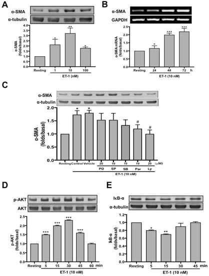 ET-1−induced α-SMA expression in human PMCs is PI3K/AKT and NF-κB dependent. (A) Primary human PMCs were treated with or without (resting) the indicated concentration of ET-1 for 72 h, and α-SMA was analyzed by Western blotting. (B). Primary human PMCs were treated with ET-1 10 nM for the indicated times, and the mRNA expressions of α-SMA were analyzed by semiquantitative reverse transcriptase PCR. (C) MeT-5A cells were preincubated with the vehicle, PD98059 (PD, 20 μM), SP600125 (SP, 10 μM), SB203580 (SB, 10 μM), Parthenolide (Par, 10 μM) or LY294002 (LY, 20 μM), then ET-1 was added for 24 h, and α-SMA was analyzed by Western blotting. (D,E) MeT-5A cells were treated without (resting) or with ET-1 10 nM for the indicated times, and phosphorylated AKT, total AKT or IκB-α were analyzed by Western blotting. The relative folds of densitometric data were expressed as the mean ± SD of three independent experiments. * p < 0.05, ** p < 0.01 and *** p < 0.001 compared with resting group; # p < 0.05 compared with vehicle group. ET-1, endothelin-1; AKT, protein kinase B; α-SMA, α-smooth muscle actin; PI3K, phosphatidylinositol 3-kinases; GAPDH, glyceraldehyde 3-phosphate dehydrogenase; IκB-α, inhibitor of κB-α.
