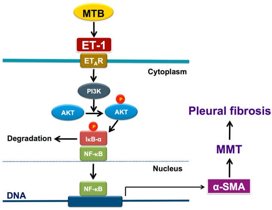 Schematic diagram of the activated signalings of MMT in human pleural mesothelial cells upon Mycobacterium tuberculosis infection and ET-1 stimulation. Mycobacterium tuberculosis induces production of ET-1 that binds to ET-A receptor and results in phosphorylation of PI3K/AKT and activation of NF-κB, leading to expression of α-SMA and subsequent MMT and pleural fibrosis (see text for further explanation). ℗ phosphorylated; AKT, protein kinase B; α-SMA, α-smooth muscle actin; ET-1, endothelin-1; ETAR, ET-A receptor; IκB-α, inhibitor of κB-α; MMT, mesothelial mesenchymal transition; MTB, Mycobacterium tuberculosis; NF-κB, nuclear factor-κB; PI3K, phosphatidylinositol 3-kinases.