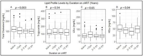 Median (interquartile range) values of lipid profile levels among treatment naïve and antiretroviral therapy experienced HIV-infected children with varying duration of treatment, 2016–2018. Figure 1 depicts the lipid profile levels by duration on cART. (A) shows total cholesterol levels by duration on treatment. The median total cholesterol of children who have taken cART for more than 5 years was significantly lower than cART naïve children (p = 0.003); children who have been on treatment for less than 2 years and those who have taken treatment for 2–5 years had lower total cholesterol values, but both were not statistically significant (p > 0.05); (B) shows the triglyceride levels by treatment duration. There was no statistically significance difference in the median triglyceride level by duration of treatment (p > 0.05); (C) shows LDLc (low density lipoprotein cholesterol) levels by treatment duration. There was no statistically significant difference in the median LDLc values among the groups by treatment experience (p > 0.05); (D) shows HDLc (high density lipoprotein cholesterol) by treatment duration. Children who have taken cART for more than 2 years have a significantly lower median HDLc level than those who are treatment naïve (p = 0.04). yrs–years.