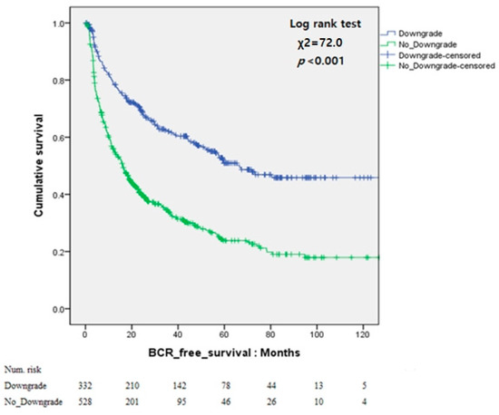 Kaplan–Meier curves for biochemical recurrence (BCR)-free survival according to pathologic Gleason score downgrade.