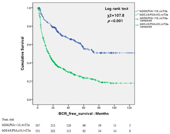 Kaplan–Meier curves for biochemical recurrence (BCR)-free survival according to bGS 8, PSA < 10 ng/mL, and ≤ cT3a.