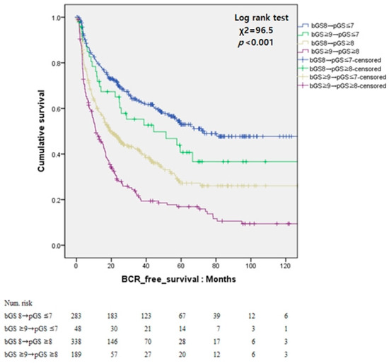 Analysis according to bGS and pGS using Kaplan–Meier curves was also conduced. In the pGS downgrade group, the Kaplan–Meier curve showed significantly better BCR-free survival than that in the other group (log-rank test, p < 0.001). The 5-year BCR-free survival rates was higher in the pGS downgrade group than that in the other group (50.9% vs. 23.8%). Also, patients with bGS 8, PSA < 10 ng/mL, and ≤ cT3a showed significantly better 5-year BCR-free survival than the other patients (55.1% vs. 23.4%, p < 0.001; Figure 1 and Figure 2).