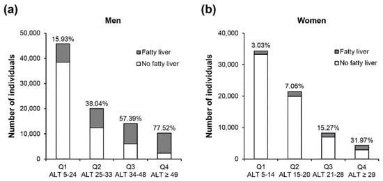 Figure 1 shows the number of individuals with a fatty liver relative to the total population by sex-specific ALT quartiles in men (a) and women (b). ALT quartiles were determined in those with a fatty liver, and had wider ranges and higher concentrations in men than women. In both men and women, the proportion with a fatty liver relative to the total population (with and without fatty liver) increased from Q1 to Q4. Interestingly, the majority of men (77.5%) in the highest quartile had a fatty liver vs. 32% of women in Q4.