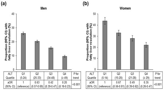 Odds ratio (95% confidence interval, CI) for fatty liver resolution by ALT quartiles in men (a) and women (b). OR is adjusted (aOR) for age, sex, baseline BMI, BMI change, education, exercise, smoking and alcohol intake (g/day). ALT = alanine aminotransferase, BMI = body mass index.