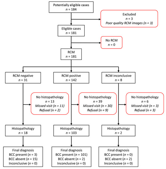 An electronic database search and chart review from the two participating centers identified 184 potentially eligible BCC cases. After evaluating each case for inclusion and exclusion criteria, we excluded three cases due to the poor quality of RCM images. Out of the 181 eligible BCC cases, 58 had not received the index test or the reference standard, hence they were excluded. The two inconclusive RCM cases with histopathological analysis were treated as test positives, leaving a total number of 123 lesions from 87 patients for further analysis (Figure 1).