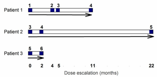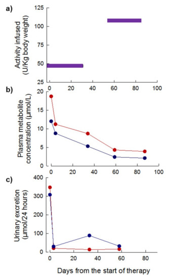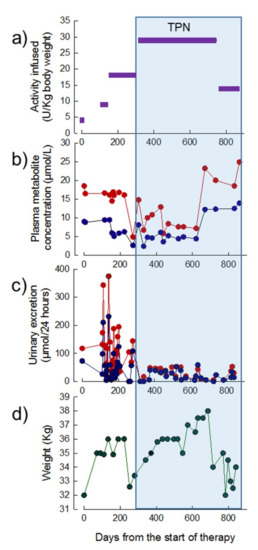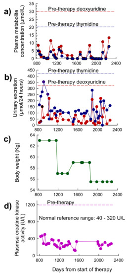 Four treatment cycles were administered over a period of 83 days. The initial EE-TP dose administered was 43 U/kg and this was escalated to 108 U/kg every four weeks in treatment cycles 3 and 5, respectively (Figure 8a). The pre-treatment plasma concentrations of thymidine and deoxyuridine were 12 µmol/L and 19 µmol/L, respectively; these declined to intra-cycle values of less than 4 µmol/L and 2 µmol/L for thymidine and deoxyuridine, respectively, from 60 days onwards (Figure 8b). By day 3 of treatment, the intra-cycle urinary excretion rates of thymidine and deoxyuridine rapidly declined from 308 and 448 µmol/24 h pre-therapy to levels less than 21 µmol/24 h for deoxyuridine and 30 to 89 µmol/24 h for thymidine (Figure 8c). Longitudinal assessments of disease scoring and the SF36 health and well-being survey were not conducted due to the premature termination of therapy due to the patient’s inability to sustain long distance travel to the United Kingdom (UK) once per month to receive treatment. The patient’s weight remained unchanged from the pre-therapy measure of 31.7 kg.