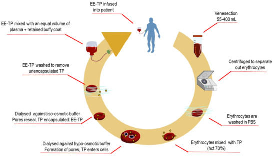 Manufacture of erythrocyte-encapsulated thymidine phosphorylase (EE-TP). Following venesection, blood was transferred to a Class A isolator for the manufacture of EE-TP under a Specials according to the Rules and Guidance for Pharmaceutical Manufacturers 2007 (MHRA). Blood was centrifuged to separate components and then the erythrocytes washed with phosphate buffered saline (PBS). Erythrocytes were then mixed with an appropriate activity of thymidine phosphorylase (TP) to a haematocrit of 70% and then dialysed against hypo-osmotic buffer for 90 min to create pores in the cell membrane. The lysed erythrocytes were then resealed by dialysis against iso-osmotic buffer for 60 min to encapsulate TP that had entered the cells. The resulting EE-TP was then washed to remove encapsulated TP, mixed with the retained buffy coat and an equal volume of autologous plasma, and then infused into the patient.