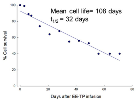 In vivo survival was assessed by monitoring the disappearance of 51Cr label from the circulation; 10 mL blood samples were taken from a vein in the contralateral arm 3, 6, 8, and 14 days, and then weekly until activity was not noticeably above background. To check for intravascular haemolysis, 51Cr activity was measured in plasma. Percentage raw cell survival was calculated by expressing the CPM/mL packed cells as a percentage of the calculated zero time value, after correction for natural decay. The data were then plotted against time on a semi-logarithmic scale and a best-fit line fitted. T1/2 thymidine phosphorylase-loaded erythrocyte survival was taken as the time for the concentration of 51Cr in the circulating blood to fall to 50% of its initial value. For the determination of mean cell life, CPM/mL packed cells (corrected for both natural decay and chromium elution from the erythrocytes) were expressed as a percentage of the corrected zero time value. The cell survival data were plotted against time on a linear scale and the mean cell life span derived from the intercept that was obtained by extrapolation of the line to zero activity.