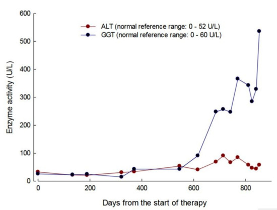 Serum alanine minotransferase (ALT) and gamma-glutamyl transpeptidase (GGT) activities in patient 1 during 31 treatment cycles of EE-TP administered over 28 months. The blue symbols represent GGT and red symbols ALT.
