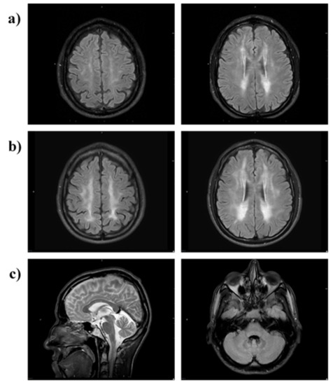 Brain MRI at month 28 of therapy showed almost symmetric, patchy areas of FLAIR and T2 hyperintensity in the cerebral periventricular, deep, and subcortical white matter (Figure 7a). A follow-up brain MRI at 63 months showed a progression of T2/FLAIR hyperintense cerebral white matter changes (Figure 7b). Relative sparing of the U fibres and the corpus callosum was noted (Figure 7c, left image). Infratentorially, there was minor symmetrical FLAIR hyperintense signal change in the cerebellar peridentate white matter (Figure 7c, right image).