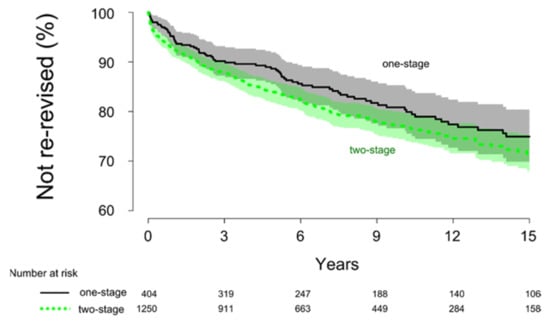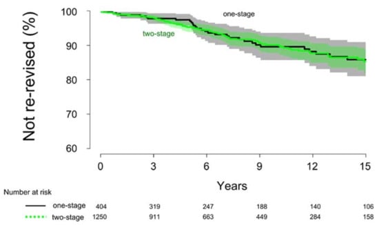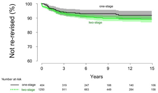 Based on the hazard ratio calculations and the Kaplan–Meier survival analyses, re-revision rates due to infection showed no significant difference between the two revision groups. Systematic reviews have not been able to find a significant difference in infection resolution between the one- and two-stage procedures [12,13,14]. A recent study, conducted by pooling individual participant data, could not find any difference in infection resolution between the methods either [21]. These findings support our results.