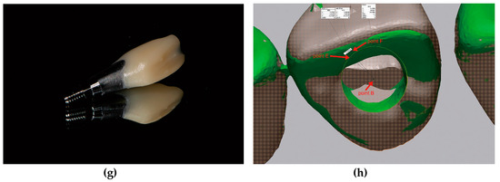 After evaluating the marginal adaptation, the provisional restorations were cemented to the corresponding abutments using resin cement (Multilink N, Ivoclar Vivadent, Schaan, Liechtenstein), producing screw-type immediate provisional restorations (Figure 2g).