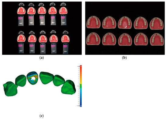 Comparison of the post-operative immediate provisional restoration position with the predesigned restoration position; (a) Ten sets of preparations prior to implant placement arranged in two rows (from top to bottom within each row) as follows: implant surgical guides, typodonts and customized prefabricated screw-type immediate provisional restorations placed above the typodonts, and implant fixtures; (b) Ten maxillary typodonts after the placement of implants and screw-type immediate provisional restorations; (c) An example image showing the difference between the pre-operative data and the post-operative scan data using metrology software (Geomagic Control X version 2018.0.1, 3D Systems, Cary, NC, USA). The critical value was set at ±1000 µm, and the tolerance value was set at ± 100 µm.
