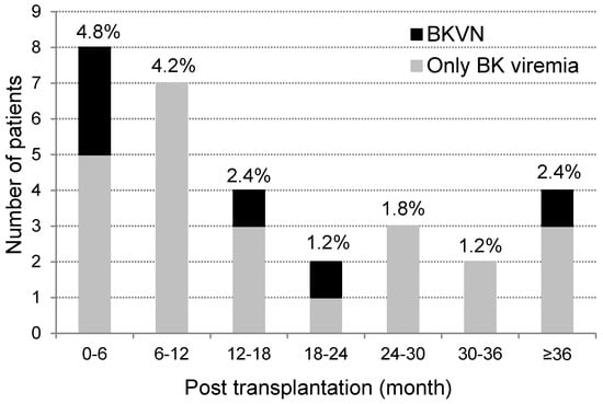 Onset of BK viremia after kidney transplantation. Values are represented as number of patients (% of total subject population).