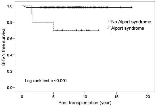 Although Alport syndrome comprised 6% of the study population (10 of 168 patients), as the primary disease of the native kidneys it accounted for 50% of BKVN patients. The prevalence of BK viremia was 30% (3 of 10 patients) for Alport syndrome, and all BK viremia in patients with Alport syndrome progressed to BKVN, whereas BK viremia was found in 17.1% of the remaining patients (other than Alport syndrome as their primary disease, 27 of 158 patients), and only 11.1% of those with BK viremia progressed to BKVN. In addition, BK viremia was detected relatively late in patients with Alport syndrome at 16, 24, and 60 months after transplantation (Table 3), and the initial viral load was higher, with a median 68,919 copies/mL (versus 4773 copies/mL in others with BK viremia, p = 0.001). BK viremia did not resolve in these patients, despite treatment for more than 2.2 years. BKVN-free survival curves of individuals with Alport syndrome and other patient groups also showed significant differences (Kaplan–Meier analysis, log-rank test p < 0.001, Figure 2).