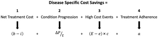 A cost savings equation (Figure 1) has been developed to explore the impact of each of these disease management areas on total healthcare expense per affected patient per year. By utilizing various cost ranges published in peer-reviewed literature, an estimate of potential annual cost savings can be derived.
