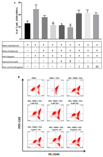 BMSCs at P4 were seeded to 24 well plates at a density of 75,000 cells/well in αMEM complete medium containing hydrocortisone (1.0, 4.0, 8.0 µM) or LPS from E. coli O111:B4 (1.0, 5.0, 10.0 µg/mL). PBMCs were added to each of the wells at a density of 300,000 cells/well. This represents a sequence of wells containing BMSC: PBMC at a fixed ratio of 1:4, with increasing doses of Hydrocortisone or LPS from E. coli O111:B4. Control wells containing PBMCs only and BMSC-PBMC only with no hydrocortisone or LPS were also included. PHA-P (5 µg/mL) was added to wells to induce T cell activation. The assay plate was placed in a 37 °C, 5% CO2 incubator for 72 h, at which time the cells were harvested and stained with anti-CD3 and anti-CD45 antibodies and subsequently analyzed using an Accuri C6 Flow Cytometer for T cell enumeration.