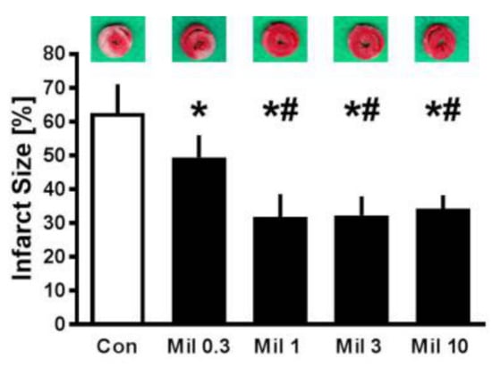 Infarct size measurement. The infarct size of controls (Con) and different concentrations of milrinone (Mil) preconditioning. For each group, an exemplary heart slice is shown. Data are mean ± SD. * p < 0.05 vs. Con, # p < 0.05 vs. Mil.