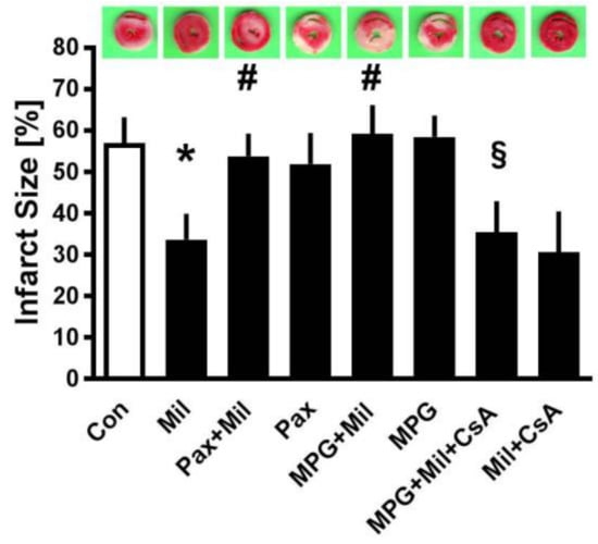 Infarct size measurement. The infarct size of controls (Con) and preconditioning with milrinone (Mil), with or without the mBKCa-channel inhibitor paxilline (Pax), the ROS scavenger N-2-mercaptopropionylglycine (MPG) and/or the mPTP inhibitor Cyclosporine A (CsA). For each group, an exemplary heart slice is shown. Data are mean ± SD. * p < 0.05 vs. Con, # p < 0.05 vs. Mil, § p < 0.05 vs. MPG + Mil.
