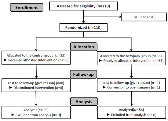 A total of 110 male patients were enrolled and allocated randomly into two groups. One patient in the nefopam group was excluded because the surgery was converted to open nephrectomy. Therefore, 109 were analyzed (Figure 1). Demographic data for these 109 male patients are shown in Table 1, and were comparable between the two groups.