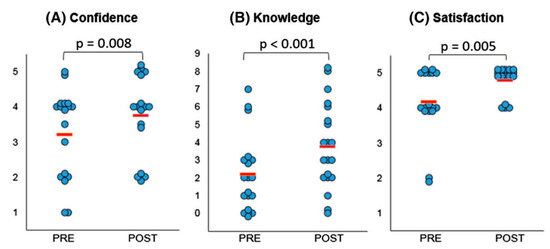 Statistically significant differences were noted in confidence (A), knowledge (B), and satisfaction (C) amongst participants comparing responses before (“Pre”) and after (“Post”) their medical consultation. (A) 1 refers to not at all confident and 5 very confident. (B) Each point represents a point in knowledge, as marked based on the correct name of primary diagnosis, correctly identified keywords, and correct use of diagrams. (C) 1 indicates very dissatisfied and 5 very satisfied. The red lines indicate average score. Reprinted with permission under the open access from Biglino et al. [36].