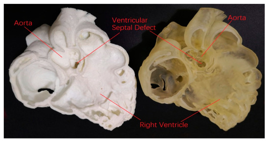 Despite limited studies available in the literature regarding quantitative assessment of 3D printed heart models, the accuracy of 3D printed heart models is within 1 mm in terms of dimensional differences when compared to the original images. Lau et al. compared model accuracy between contrast-enhanced CT images of the 3D printed heart model (Figure 2 and Figure 3) and original cardiac CT images in 10 anatomical locations including ventricular septal defect (VSD) [16]. High accuracy was achieved between these measurements by only 0.23 mm difference in average. Ma et al. in their study comprising 35 patients of Tetralogy of Fallot (ToF), compared measurements of VSD sizes between 3D printed models and intraoperative findings with no significant differences found (mean value ± standard deviation: 14.98 ± 1.91 vs. 15.11 ± 2.06 mm, p > 0.05) [19]. This is further confirmed by a multi-center study showing the model accuracy. Valverde et al. recruited 40 patients diagnosed with complex CHD from 10 international centers in their prospective study [21]. 3D printed models were created from CT or MRI images, and they were found to be highly accurate with mean differences of 0.27 ± 0.73 mm between measurements performed on the 3D printed models and CT/MRI images.