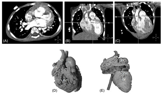 Example of double outlet right ventricle with aorta and pulmonary artery arising from the right ventricle and perimembranous ventricular septal defect from computed tomography images (A–C). Anterior view of the 3D printed heart model, aorta, and pulmonary artery are side-by-side with both arising from the right ventricle (D). Perimembranous VSD remoted from the arteries. Position of potential intracardiac tunnel from the left ventricle to the aorta is shown as the solid lines (E). AO—ascending aorta; LA—left atrium; LV—left ventricle; PA—pulmonary artery; RA—right atrium; RV—right ventricle; VSD—ventricular septal defect. Reprinted with permission from Zhao et al. [32].