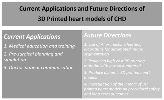 Currently, no guidelines or recommendations are available regarding the standardized use of 3D printed models in CHD patients. Use of 3D printed models is limited to complex CHD such as DORV (Figure 10) and ToF as evidenced by anecdotal reports and case series [16,21,22,23,31,32,33,56,57]. Other clinical benefits of using 3D printed heart models such as its impact on procedural safety and long-term outcomes are still yet to be investigated. Future research should focus on these areas as they will contribute to the development of clinical recommendations of using 3D printed models routinely in medical practice, therefore having great impact on the treatment of congenital heart disease. Figure 11 presents a summary of the current applications and future directions of 3D printing in CHD.