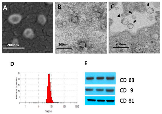 Characterization of extracellular vesicles (EVs). (A) Scanning electron microscopic image of EVs loaded on a polycarbonate membrane. EVs were isolated from conditioned media of cultures for human umbilical cord blood-derived mesenchymal stem cell (MSC) using ultra-centrifugation. (B) Transmission electron microscope (TEM) photograph of EVs. EVs were placed on copper grids and stained with uranyl acetate with showing round shape. (C) TEM image of EVs being secreted from an MSC membrane. (D) Particle size distribution of EVs using Zetasizer analysis. The Y-axis represents the number of EVs and the X-axis represents the size of EVs analyzed by the Zetasizer showing a main peak around 60–80 nm. (E) Western blots for three consecutively separated EVs, indicating exosome marker proteins of CD63, CD9, and CD81, respectively.