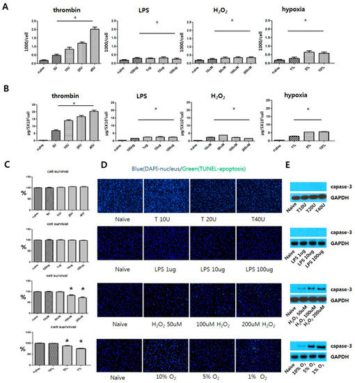 Effects of various preconditioning for umbilical cord blood-derived mesenchymal stem cells (UCB-MSCs) on exracellular vesicle (EV) production, cell viability, and cell death. MSCs were preconditioned by treatment of thrombin (5 U, 10 U, 20 U, and 40 U), LPS (100 ng, 1 μg, 10 μg, and 100 μg), H2O2 (10 μM, 50 μM, 100 μM, and 200 μM), and hyoxia (10% O2, 5% O2, 1% O2) for 6 h, respectively. (A) Representative nanoparticle tracking (NTA) analysis for isolated EVs expressed with total counts of EVs divided by the total number of MSCs. (B) Total protein concentration of isolated EVs from 5 × 105 MSCs measured by the Bradford method. (C) Each preconditioning status was processed for 6 h and analyzed by the MTT assay after 24 h. (D) Terminal deoxynucleotidyl transferase dUTP nick end labeling (TUNLE) staining for MSCs in each culture condition. TUNEL-positive cells were labeled with fluorescein isothiocyanate (FITC) (green) and the nuclei with DAPI (blue). (E) Representative Western blot for caspase-3 expression of MSCs in each preconditioning status. Data are presented as mean ± SEM. Statistical analyses were carried out using a One-way Analysis of Variance (ANOVA). The asterisk (*) indicates the p < 0.05 compared with naïve UCB-MSCs.