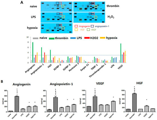 We assayed a Proteome Profiler Human Angiogenesis Array and ELISA to determine whether changes in the various UCB-MSC culture conditions caused changes in the angiogenesis factors in EVs isolated from UCB-MSCs. Figure 4 demonstrates the preconditioning regimen-dependent variation in the protein cargo content with the Proteome Profiler Human Angiogenesis Array and the ELISA assay. All the preconditioning regimens except LPS preconditioning increased the angiogenic growth factors such as angiogenin, angiopoietin-1, HGF, and Vascular endothelial growth factor (VEGF) within the EVs compared with the naïve MSC EVs (Figure 4A). Angiogenin, angiopoietin-1, HGF, and VEGF more than tripled compared to naïve controls, when confirmed the protein level using the ELISA method (Figure 4B). Thrombin preconditioning optimally enhanced the angiogenic protein cargo contained within the EVs compared with the preconditioning regimens with H2O2 and hypoxia.