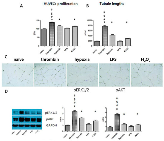 EVs isolated thrombin-treated UCB-MSCs were measured using ELISA to determine how much thrombin was included, since thrombin is a known mitogen factor that is a potent promoter of angiogenesis [23,24]. There were no differences between group of negative control, naïve EVs, and thrombin EVs, which suggest no contamination of thrombin in thrombin EVs (Figure S1). All preconditioning regimens except LPS promoted HUVEC proliferation significantly more (Figure 5A), although fasting serum inhibit cell proliferation. Figure 5C shows that the HUVECs cultured in EVs derived from thrombin-treated UCB-MSC-conditioned media markedly produced capillary-like tubes compared with HUVECs cultured in EVs derived from LPS-, H2O2-, and hypoxia-treated UCB-MSC-conditioned media. Quantitative analysis shows that thrombin-treated EVs are statistically superior to LPS-, H2O2-, and hypoxia-treated EVs (Figure 5B). These results indicated that thrombin preconditioning optimally improved the proangiogenic effects of EVs compared with preconditioning regimens with H2O2 and hypoxia. The activation of MAPK and Akt signaling pathways is known to be involved in the proliferation of HUVECs [25,26]. Thus, we investigated the effects of EVs derived from UCB-MSCs on the phosphorylation of Akt and ERK1/2 in HUVECs. The pERK1/2 and pAKT of EVs were significantly increased with all preconditioning regimens, except for that with LPS preconditioning, compared with the naïve MSC-derived EVs, and optimally increased with thrombin preconditioning compared with preconditioning regimens with H2O2 and hypoxia (Figure 5D).