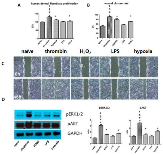 The promotion of proliferation of human dermal fibroblasts with stimulation of EVs. (A) Proliferation rates of human fibroblasts following treatment with normal and thrombin-, 10% O2-, LPS-, H2O2-treated EVs for 24 h. Wound closure rate was detected by wound scratch assays as described in Materials and Methods. (B) Rates of wound closure were quantified using Image J. (C) Representative images of wound scratch assays at the treatment of the normal control and with thrombin, H2O2, LPS, and hypoxia. (D) Lysate from human dermal fibroblast cells treated with EVs for 24 h subjected to Western blot analysis. Cell lysate was analyzed by immunoblotting and normalized to GAPDH, and the ratio of densitometry to GAPDH is shown beneath the blots. Data are presented as mean ± SEM. Statistical analyses were carried out using a One-way Analysis of Variance (ANOVA). The asterisk (*) indicates p < 0.05 compared with naive EVs, the number sign (#) indicates p < 0.05 compared with the 10% oxygen-treated EV group, the double dagger (‡) indicates p < 0.05 compared to the H2O2-treated EV group, and the dollar sign ($) indicates p < 0.05 compared with the LPS-treated EV group (n = 5 per each analysis).