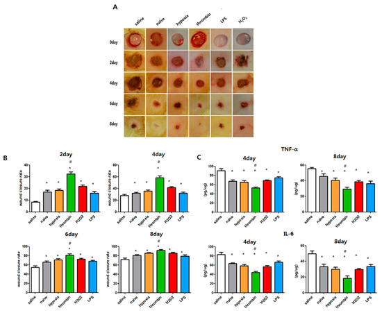 Comparison of wound healing capacity of EVs with the same protein amount (20 μg) in vivo. Punch wounds of animals were treated locally with saline, naive MSC-DERIVED EVs, 10% O2 EVs, thrombin (40 U) EVs, LPS (1 μg) EVs, or H2O2 (50 μM) EVs derived from the same number of MSCs. (A) Representative serial wound images in vivo and (B) the relative wound closure rate (%) after 2, 4, 6, and 8 days of treatment (C) Cytokine analysis for TNF-α and IL-6 β in the homogenate of dissected wound tissues four and eight days after each treatment. Statistical analyses were carried out using a One-way Analysis of Variance (ANOVA). The asterisk (*) indicates p < 0.05 compared with saline, and the number sign (#) indicates p < 0.05 compared with the naive EV group (n = 4 per each analysis).