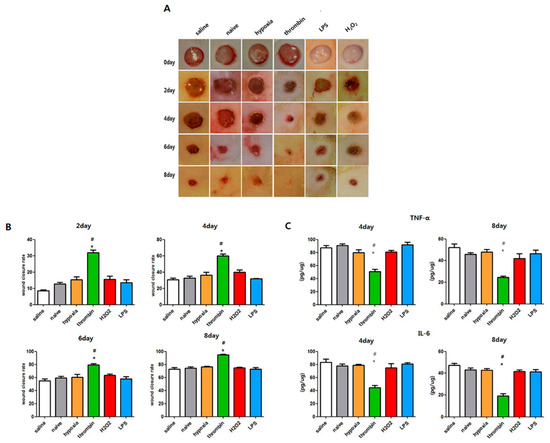 With the same amount of EV protein (20 μg/10 uL) treatment, a significantly improved cutaneous wound closure rate and less inflammatory cytokines such as TNF-α and IL-6 were observed in both the naïve and the preconditioned EVs compared with the saline-treated group. The thrombin-, H2O2-, LPS-, and hypoxia-treated EV groups had an improved wound closure rate compared with the naïve EV-treated groups. However, thrombin preconditioning more improved the cutaneous wound closure rate compared with the naïve and the preconditioning regimens with LPS, H2O2 and hypoxia (Figure 8A,B). The thrombin-, H2O2-, LPS-, and hypoxia-treated EV groups had reduced TNF-α and IL-6 levels compared with the saline-treated control group. The thrombin-treated group had significantly lower level of cytokines compared to the naïve group and the groups treated with LPS, H2O2, and hypoxia. (Figure 8C).