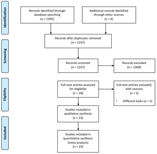 The article-selection process resulted in the inclusion of 23 studies that resulted in 31 interventions, 13 in strength tasks [12,13,14,20,21,22,24,25,27,37,38,39] and 18 in endurance tasks [13,15,16,17,19,20,24,26,27,28,29,30,31,32,33]. The studies of Kan et al. [13], Angius et al. [20], Flood et al. [24] and Angius et al. [27] were included in both MVC and TTF analysis because they explored the effects of anodal tDCS on both strength- and endurance-related variables. Furthermore, Radel et al. [16], Williams et al. [17] and Angius et al. [27] included different tDCS interventions within the same study, which were taken separately. The flow diagram of the study selection process is depicted in Figure 1. Table 1 and Table 2 show the main characteristics of the resulting studies.