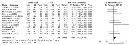 Forest plot of the comparison of MVC between anodal tDCS and sham conditions. Angius et al. [27] $—condition in which the subjects received anodal tDCS using a cephalic montage (Anode in M1 and Cathode in right DLPFC). Angius et al. [27] @—condition in which the subjects received anodal tDCS using an extracephalic montage (Anode in M1 and Cathode in shoulder).