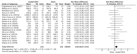 Forest plot of the comparison of TTF between anodal tDCS and sham conditions. Williams et al. [17] *—subgroup that received full time anodal tDCS during the task (i.e., submaximal isometric elbow contraction until failure). Williams et al. [17] #—subgroup that received part time anodal tDCS during the task (i.e., submaximal isometric elbow contraction until failure). Angius et al. [27] *—condition in which the subjects received anodal tDCS using a cephalic montage (Anode in M1 and Cathode in right DLPFC). Angius et al. [27] #—condition in which the subjects received anodal tDCS using an extracephalic montage (Anode in M1 and Cathode in shoulder). Radel et al. [16] *—condition in which the subjects received anodal tDCS over the PFC. Radel et al. [16] #—condition in which the subjects received anodal tDCS over the M1.
