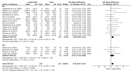 Forest plot of the subgroup analysis for the comparison of the TTF between anodal tDCS over M1 versus PFC. Williams et al. [17] *—subgroup that received full time anodal tDCS during the task (i.e., submaximal isometric elbow contraction until failure). Williams et al. [17] #—subgroup that received part time anodal tDCS during the task (i.e., submaximal isometric elbow contraction until failure). Angius et al. [27] *—condition in which the subjects received anodal tDCS using a cephalic montage (Anode in M1 and Cathode in right DLPFC). Angius et al. [27] #—condition in which the subjects received anodal tDCS using an extracephalic montage (Anode in M1 and Cathode in shoulder). Radel et al. [16] *—condition in which the subjects received anodal tDCS over the PFC. Radel et al. [16] #—condition in which the subjects received anodal tDCS over the PFC.