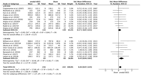 Forest plot of the subgroup analysis for the comparison of the TTF between anodal tDCS applied ≤10 min. versus >10 min. Williams et al. [17] *—subgroup that received full time anodal tDCS during the task (i.e., submaximal isometric elbow contraction until failure). Williams et al. [17] #—subgroup that received part time anodal tDCS during the task (i.e., submaximal isometric elbow contraction until failure). Angius et al. [27] *—condition in which the subjects received anodal tDCS using a cephalic montage (Anode in M1 and Cathode in right DLPFC). Angius et al. [27] #—condition in which the subjects received anodal tDCS using an extracephalic montage (Anode in M1 and Cathode in shoulder). Radel et al. [16] *—condition in which the subjects received anodal tDCS over the PFC. Radel et al. [16] #—condition in which the subjects received anodal tDCS over the PFC.