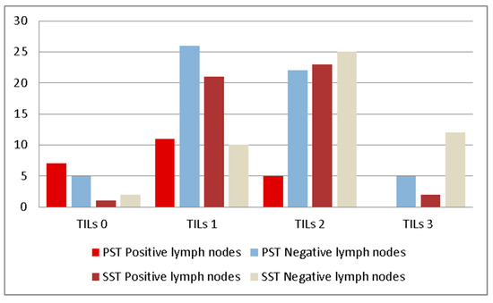 In our study, an increased number of TILs was associated with a lower number of lymph nodes metastases both in PST and SST groups. For early stage tumors for TILs over 60%, all lymph nodes were negative, with only 2 positive lymph nodes in the SST group, suggesting that lymphocytic predominant breast cancers have the lowest aggressivity. TILs can be considered valuable biomarkers that can help tailoring suitable therapies and improving the stratification of BC patients for immune-based treatment selection.