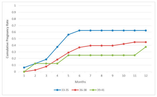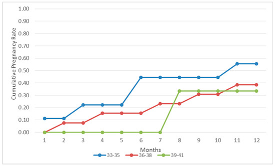 Eleven out of 25 patients that were diagnosed with pelvic adhesions achieved a pregnancy within a one-year time frame. No statistically significant difference between pregnant and non-pregnant subgroups was observed regarding age (36.18 ± 1.64 vs. 36.43 ± 1.59), years of infertility (6.27 ± 0.75 vs. 6.00 ± 0.85) and previous failed IVF attempts (4.10 ± 1.78 vs. 4.13 ± 1.84). All 11 pregnancies led to a live-birth. The time frame required for pregnancy was less than three months for three women (27.27%), between three and six months for three women (27.27%) and between six and twelve months for five women (45.45%). An analysis of the time to pregnancy according to the women’s age regarding the adhesions subgroup is presented in Figure 2. Pregnancy probabilities per month for the endometriosis and the adhesions group are presented in the form of a life table in Table 4.
