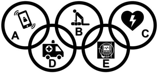 Out-of-hospital “Chain of Survival” of Sport (adapted from AHA [86]). (A) Recognition and activation of the emergency medical system, which varies according to country, city and locality; (B) immediate high-quality cardiopulmonary resuscitation, which includes administration/training/education in BLS; (C) rapid defibrillation—fast access to the automated external defibrillator; (D) access to advanced medical emergency services, which includes on-site care for sudden CA and transport to the in-hospital environment. (E) Advanced life support and post-cardiopulmonary resuscitation care—all of these actions occur in the hospital setting.